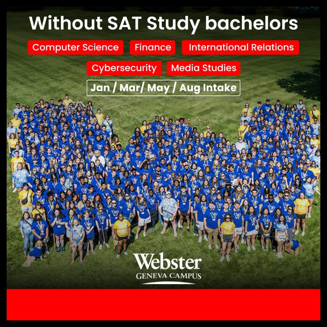 Dream of studying abroad but worried about SAT scores? Webster University Geneva Campus offers Bachelor’s programs without SAT in high-demand fields like Computer Science, Finance, International Relations, Cybersecurity, and Media Studies. With multiple intakes in Jan, Mar, May, and Aug, students from across the world come together for a truly global learning experience in Switzerland 🇨ðŸ‡. Start your international education journey with flexible entry requirements and world-class exposure. 📩 Apply now and take the first step toward your global future!