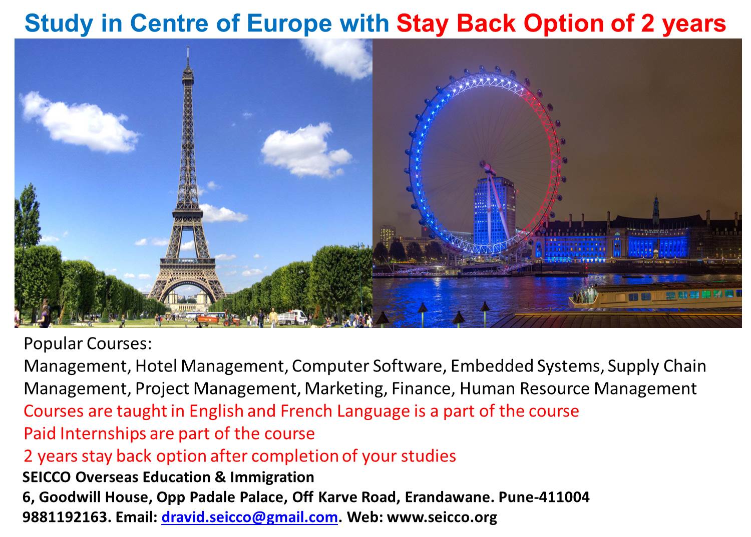 Study in France with Paid Internships and 2 years Stay Back Option !!!!! Courses in IT, Management, Supply Chain Management, Marketing, Accounting, Finanace and many more IELTS not mandatory Admission decided through Skype Interview. Contact us to know more !!! Dont miss this September Intake Contact us @ SEICCO Overseas Education & Immigration Goodwill House, Opp Padale Palace, Above Nisarg restaurant, Off Karve Road, Erandawane. Pune-411004