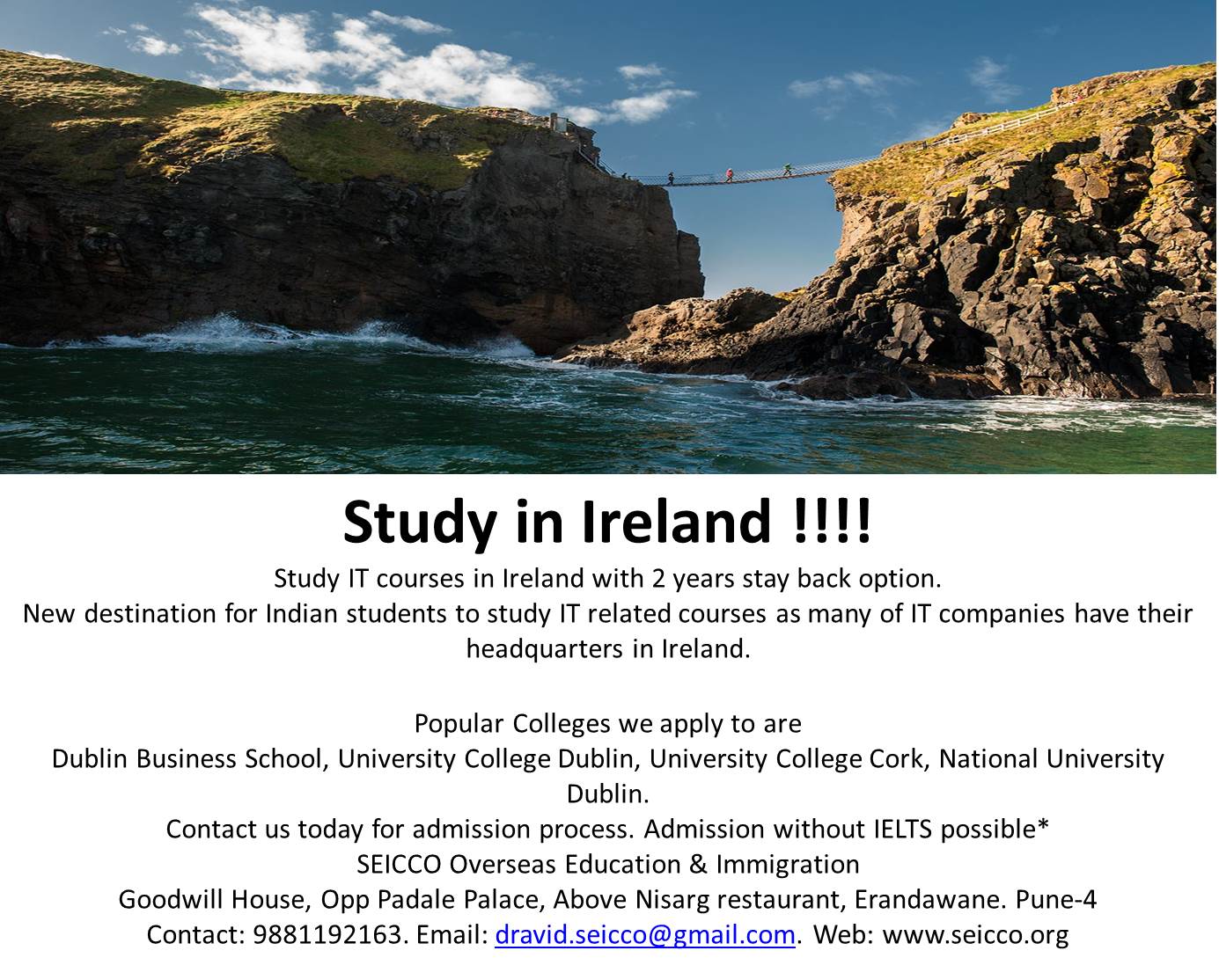 Study in Ireland !!! Study IT Courses with 2 year stay back option and job opportunities Popular colleges we apply to are DBS, UCD, National University and UCC all in Dublin. Most of the IT company headquarters are in Ireland. Contact us to apply. ADMISSIONS POSSIBLE WITHOUT IELTS SEICCO Overseas Education & Immigration Goodwill House, Opp Padale Palace, Above Nisarg restaurant, Erandawane. Pune-4