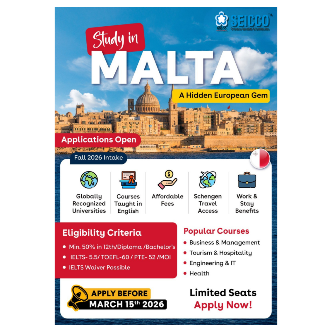 Dreaming of studying in Europe without the heavy tuition fees? Discover amazing opportunities in Malta for the Fall 2026 Intake! Why Choose Malta? Globally recognized universities Courses taught entirely in English Affordable tuition fees Schengen travel access Work & stay benefits Popular Courses: Business & Management Tourism & Hospitality Engineering & IT Health Sciences Eligibility Criteria: Minimum 50% in 12th / Diploma / Bachelor’s IELTS 5.5 / TOEFL 60 / PTE 52 / MOI IELTS Waiver Possible Limited Seats Available Apply before 15th March 2026 Take the next step towards your European education journey with SEICCO Overseas Education & Immigration. Message us today to start your application!