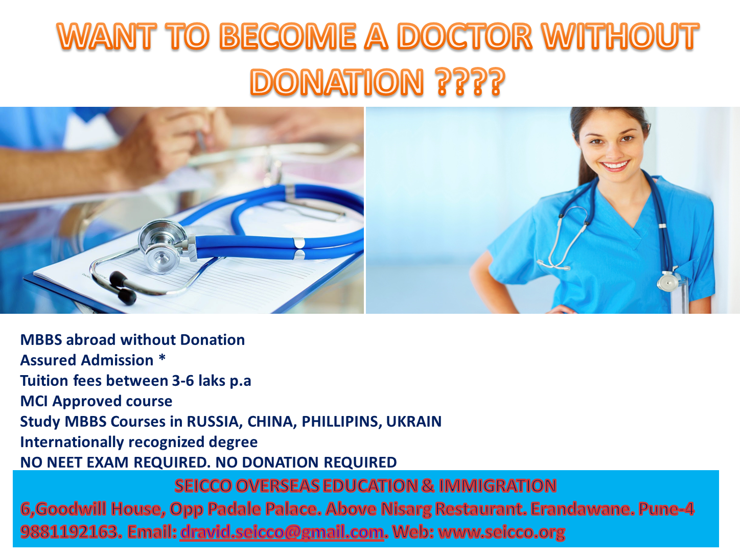 Want to become a Doctor without Donation ??? No donation required No NEET exam required. MBBS in Russia with Government Universities. Excellent opportunity for MBBS in Abroad for Indian Students !!! Call us today to book you seat, Don't miss this opportunity!!! Or visit us @ SEICCO Institute of special Education. Opp Padale Palace, above Nisarg restaurant, Off Karve Road. Pune-411004